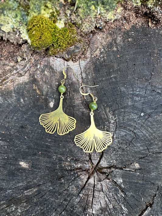 Ginkgo leaf Solid Brass Earrings with green jade, lightweight