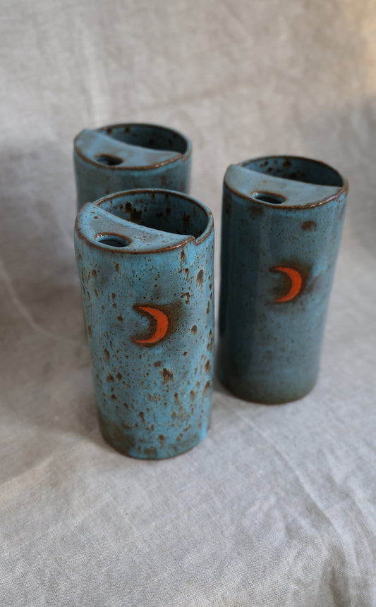 New Crescent moon travel mug with Blue feathered speckled, Mustache Saver, Ceramic Stoneware Hand Thrown in Maine 14-16oz.