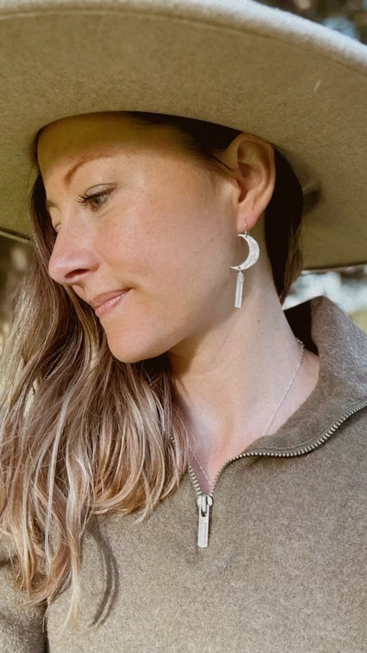 Moon and quartz, maine beach stone, textured Silver moons, celestial dangle earrings