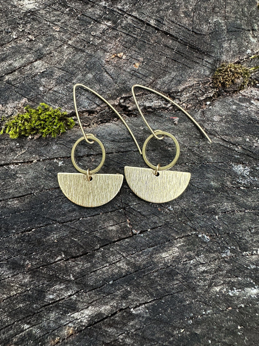 Geometric circle and half circle dangle earrings, long fun funky rustic earrings in sturdy brass