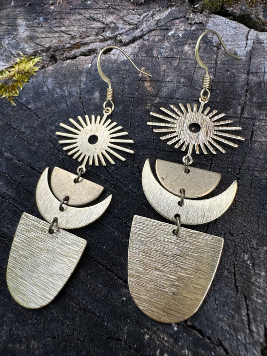 Solid brass boho sun & moon earrings with quartz