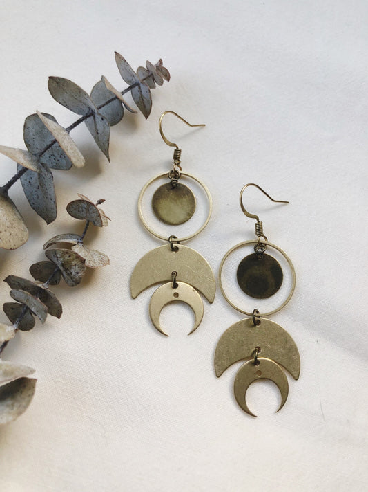 Double moon, solid brass geometric earrings, light weight, hand crafted, double moon designs, celestial theme