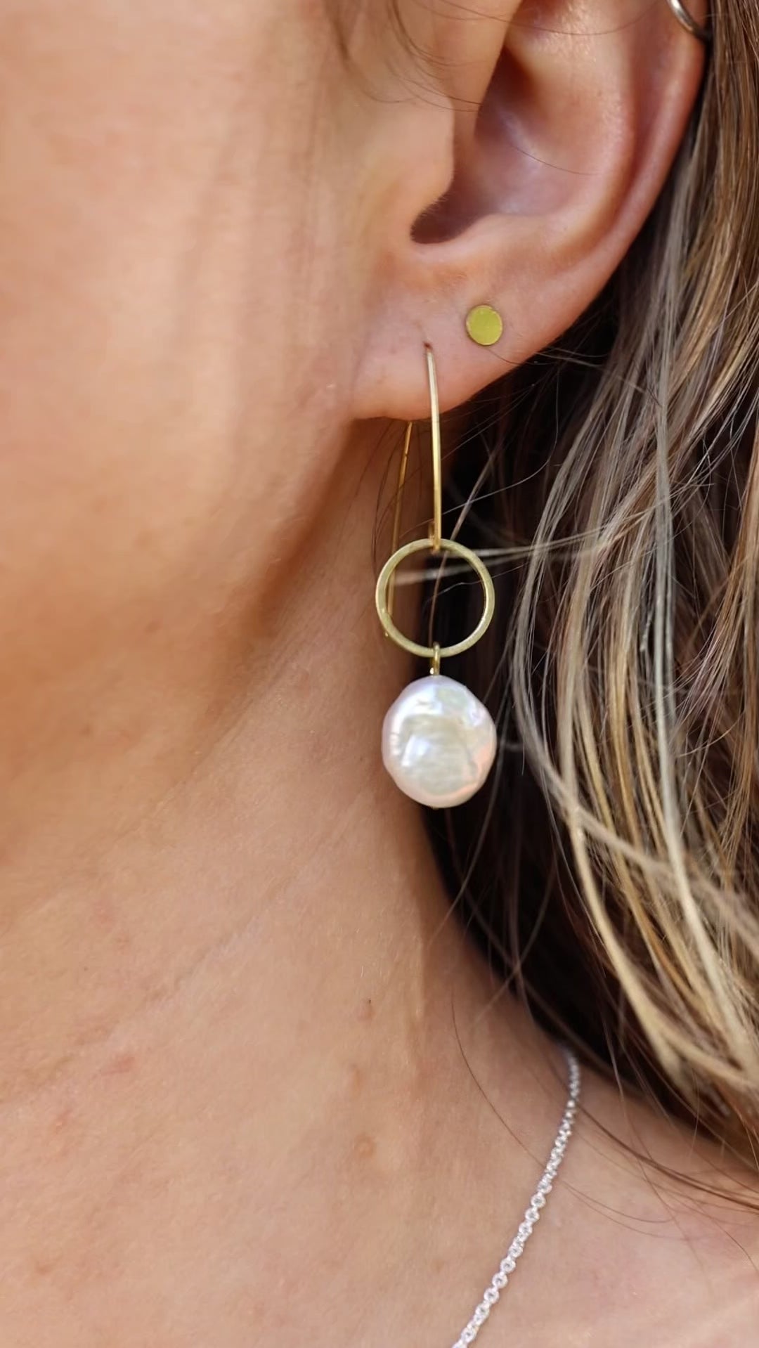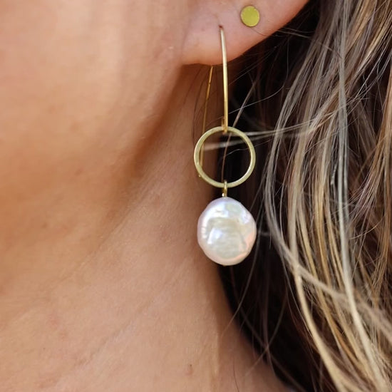 Brass minimalist earrings with fresh water pearl coins.