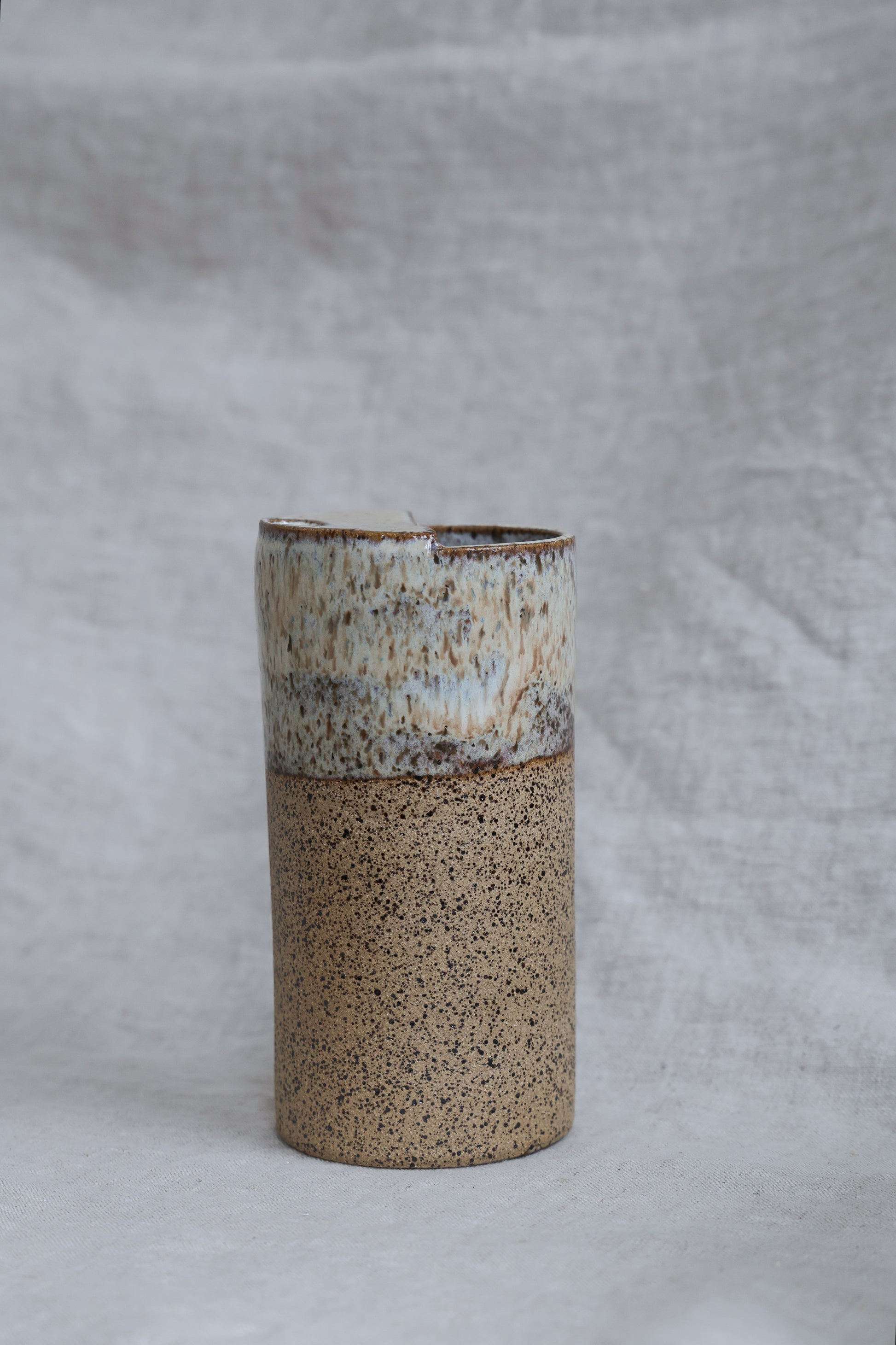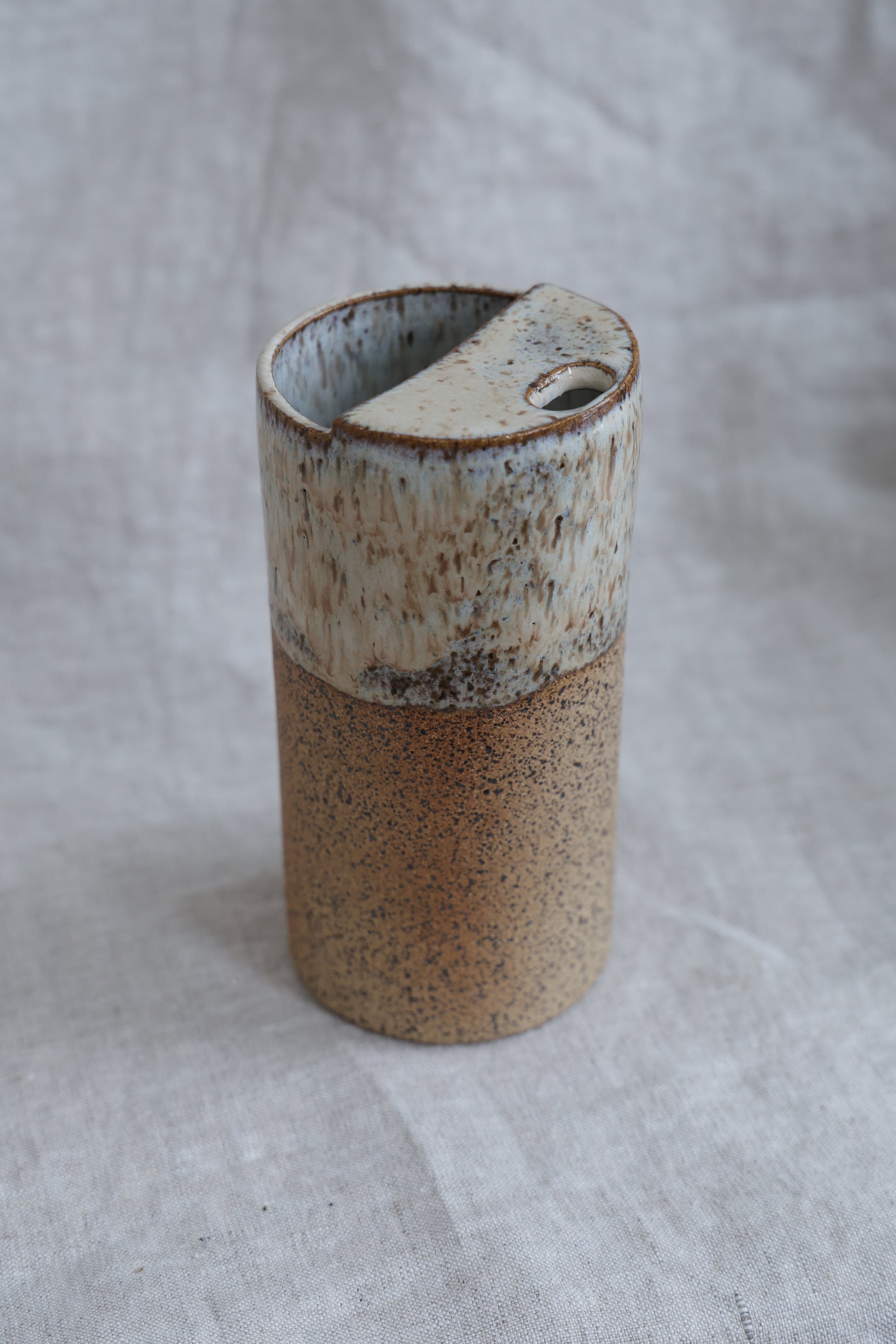 Each travel mug is thrown by hand using a beautiful neutral speckled stoneware clay, then finished with a half dip in a creamy beige glaze that lets the character of the clay come through.
