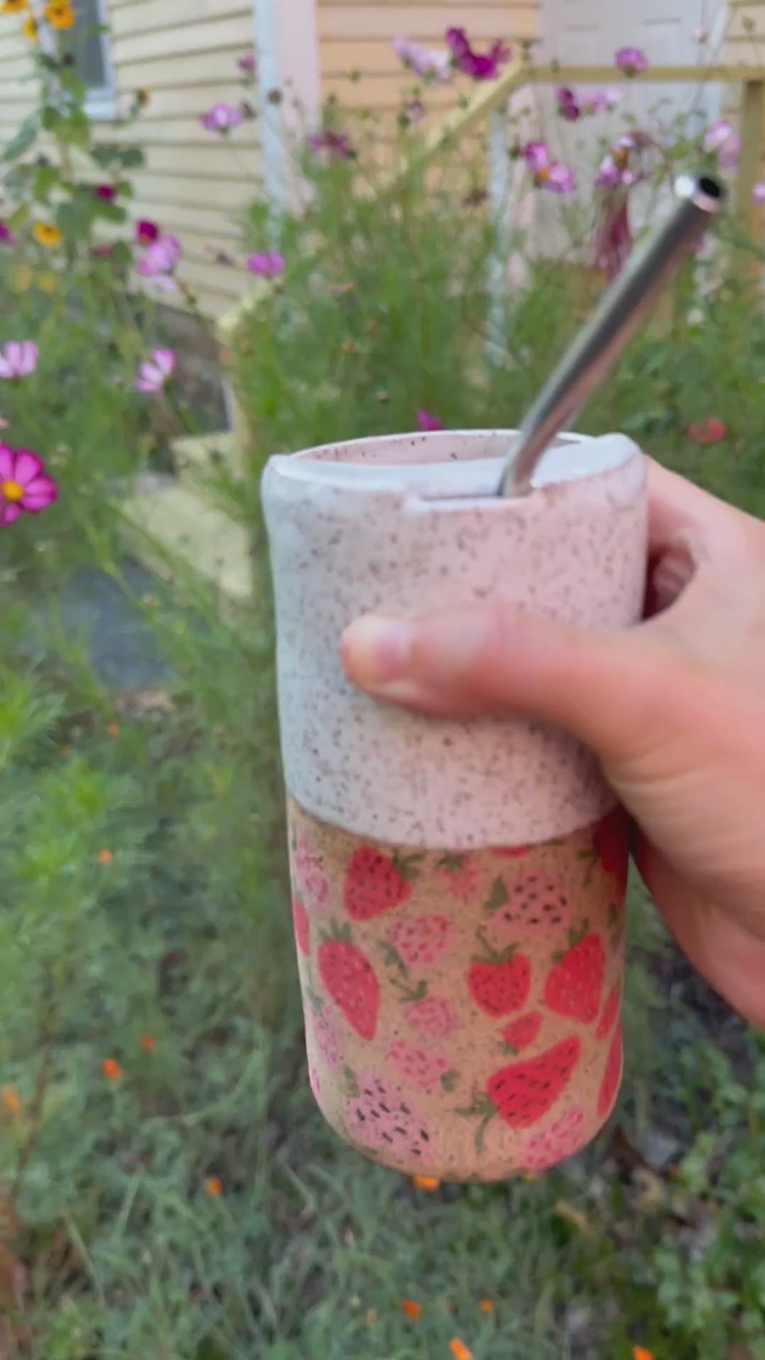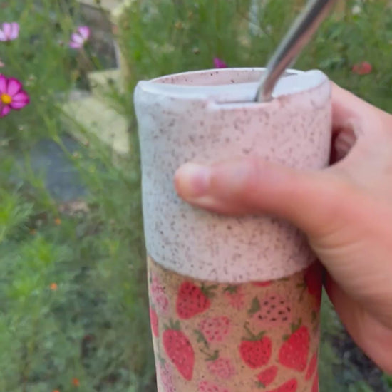 Say no to single use plastic, and yes to a greener cleaner planet with this beautiful, white speckled travel cup with strawberry pattern. Hand thrown in Gorham, Maine. Holds approximately 12 to 14 ounces