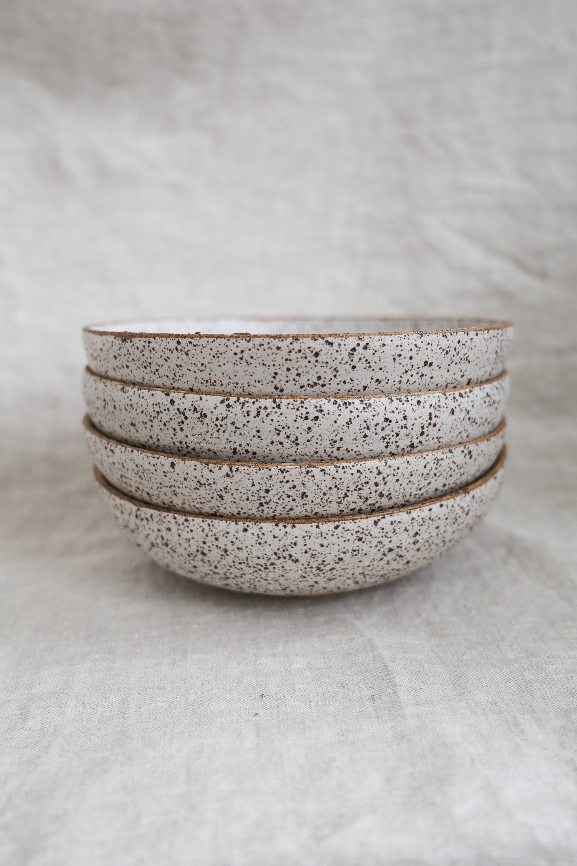 These rustic pasta bowls are made for everyday use. Each bowl is wheel-thrown and finished in a matte white speckled glaze, with a raw rim that shows the natural speckled tan clay beneath. No two bowls are exactly alike.