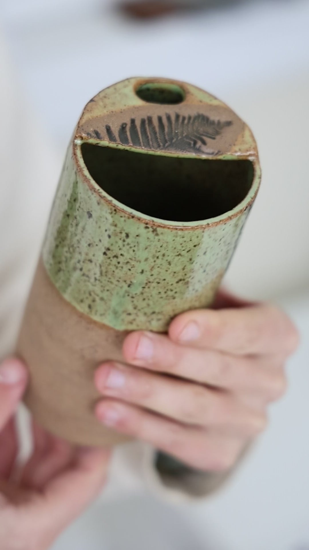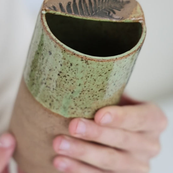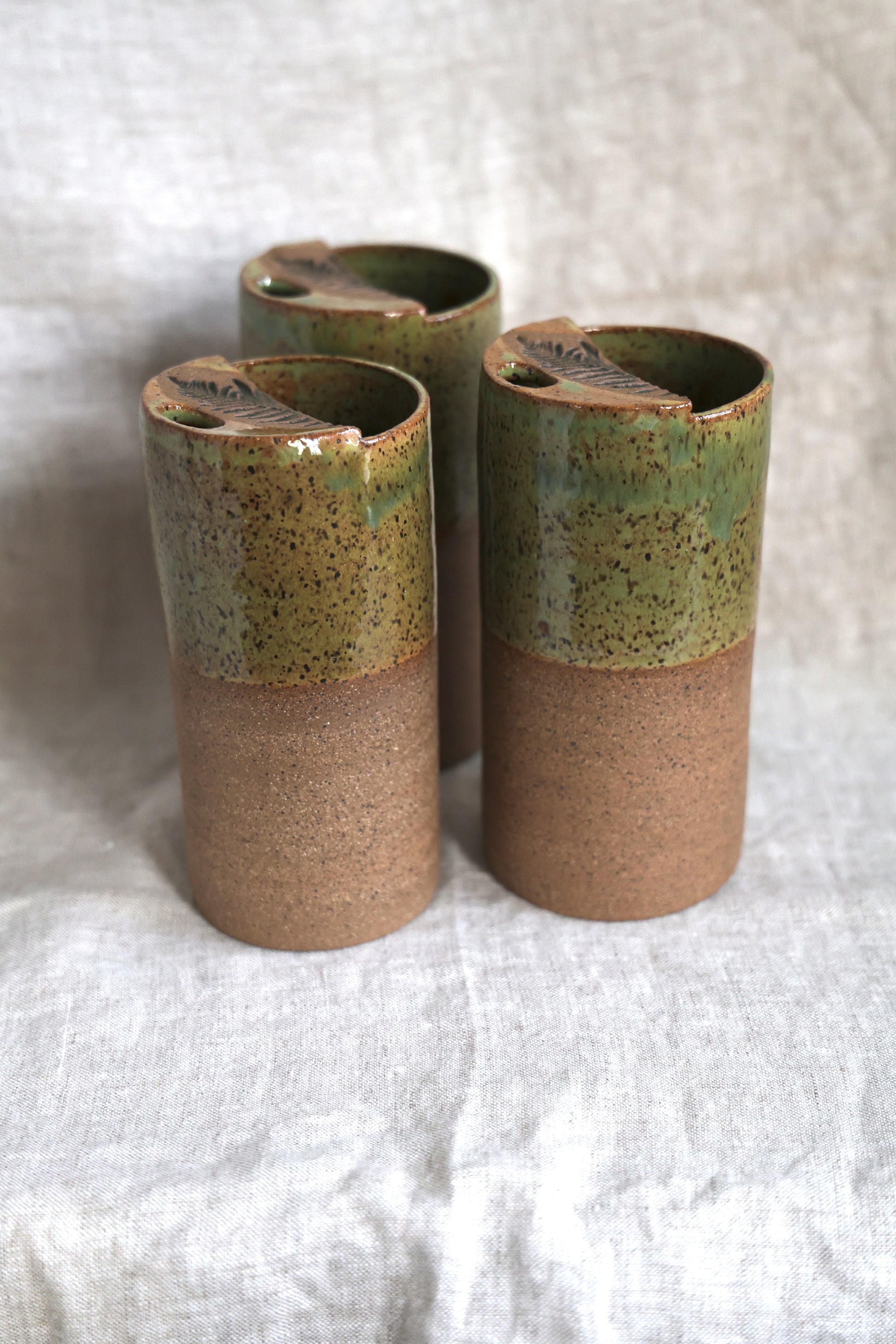 Half Dipped Green Fern Stamped Speckled Stoneware Organic Style Travel Tumbler, To Go Cup, for Minimalists Ceramic Stoneware Hand Thrown in Maine