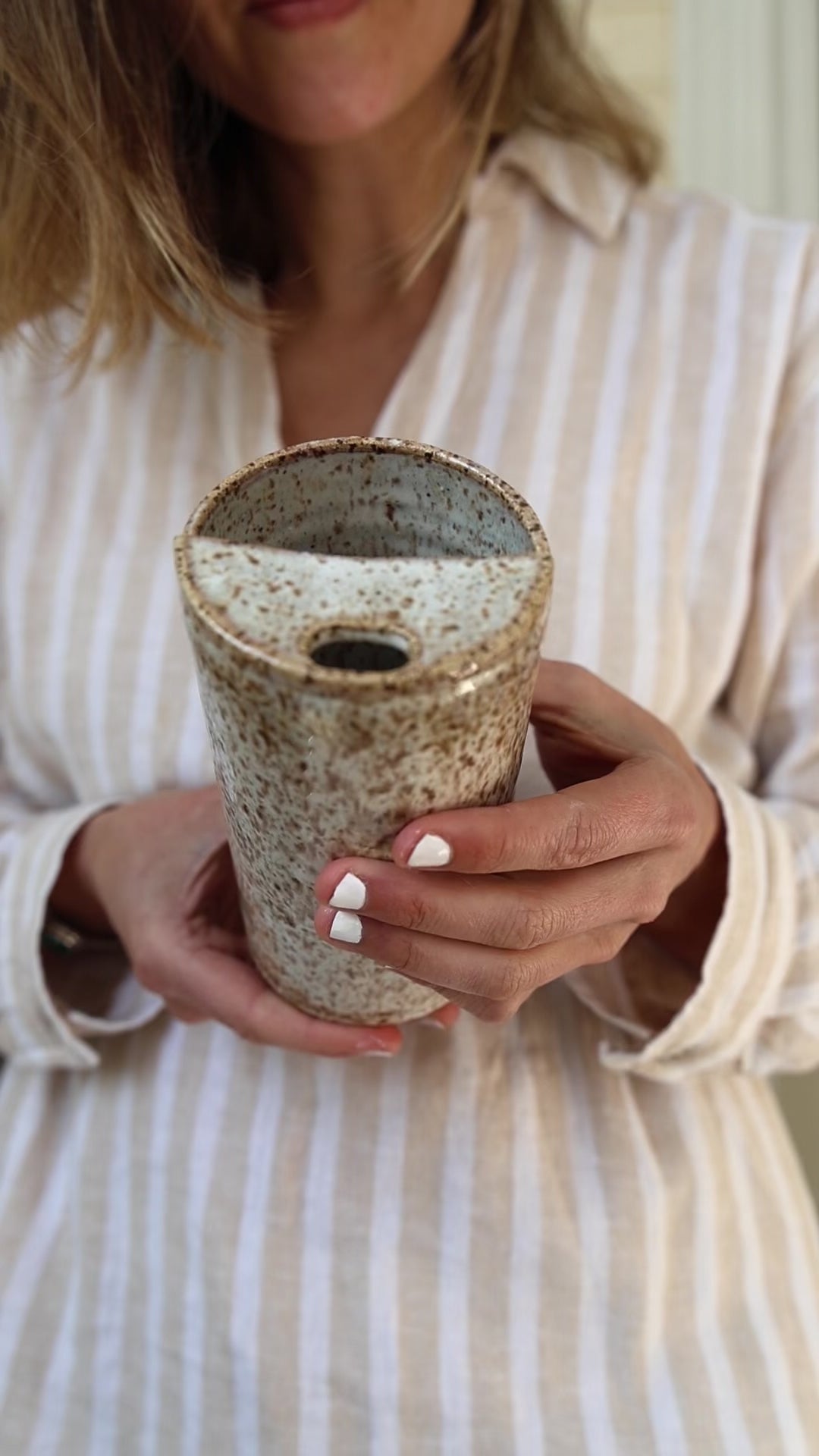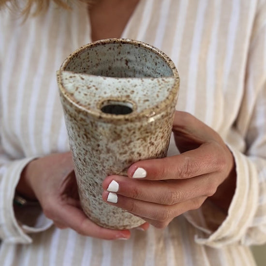 Say no to single use plastic, and yes to a cleaner planet with this beautiful, minimalist creamy white to go mug. Thrown and glazed by hand in a creamy smooth glaze, this mug is perfect for coffee, tea, smoothies, water, or all of the above. I use mine for coffee in the morning, then refill with tea and water all day long. The mouth opening is large enough to accommodate most straws.