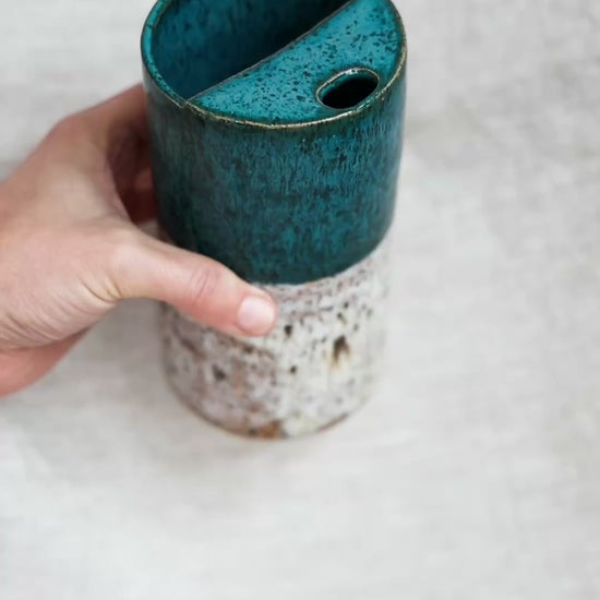 Turquoise travel mug with feathered speckled, Mustache Saver, Ceramic Stoneware Hand Thrown in Maine 14-16oz.