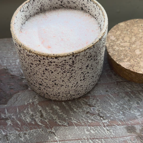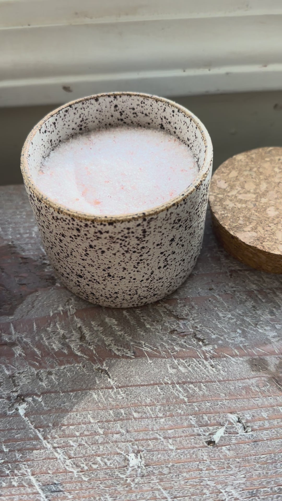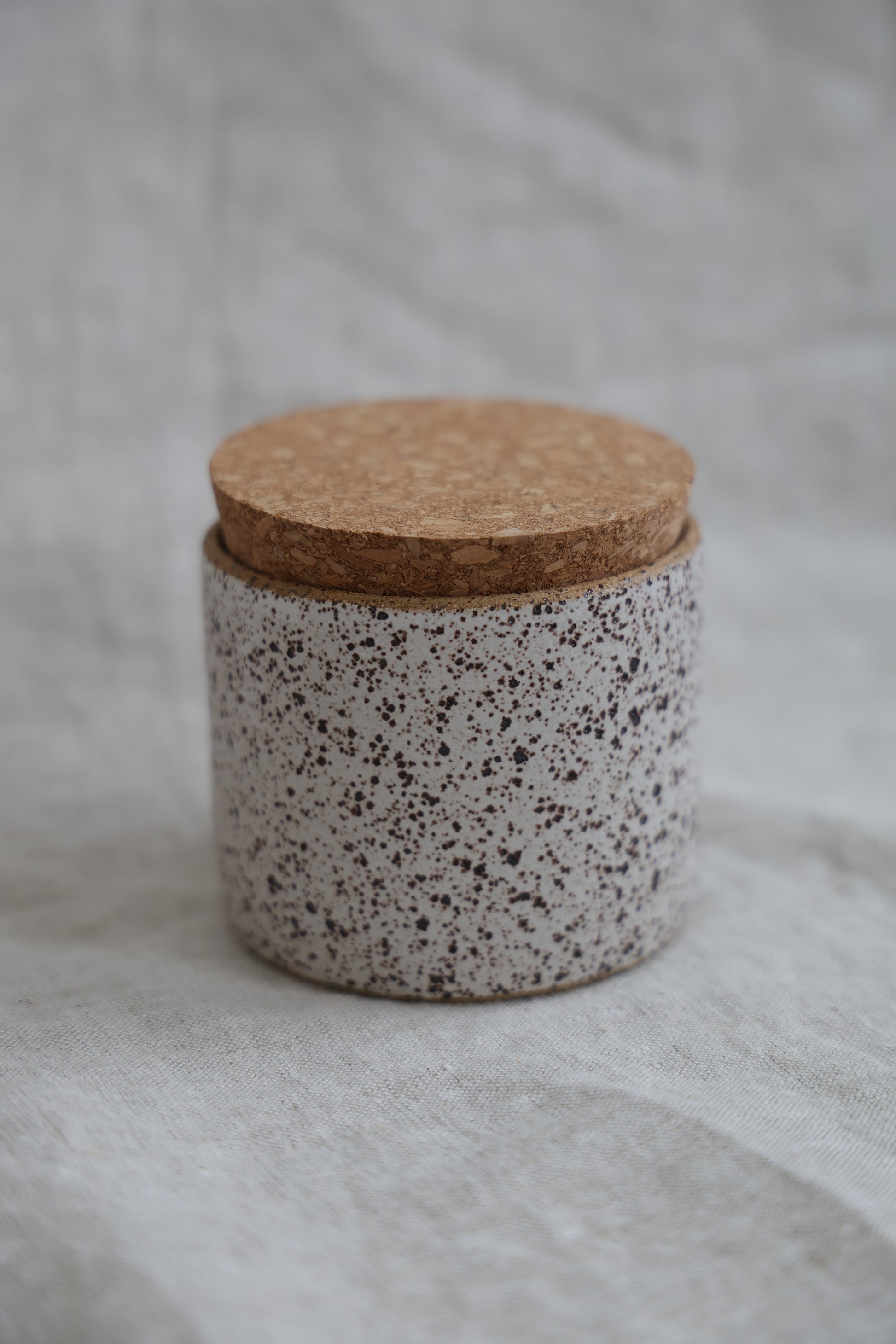 Each piece is wheel-thrown by hand in my Gorham, Maine studio and finished in a matte speckled white glaze with a raw clay rim. The natural cork lid fits snugly into the top, helping keep your salt fresh while still being easy to grab mid-recipe.