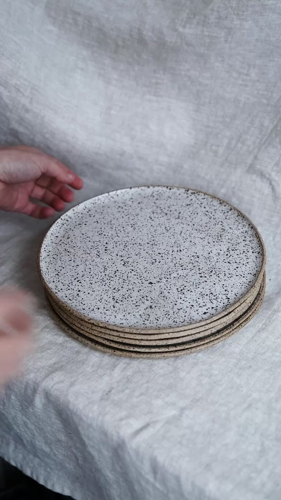 Each plate is made using a combination of hand-building and wheel-throwing techniques, which gives them a slightly irregular, wabi-sabi quality. The surface is finished in a matte white speckled glaze, with a raw rim that shows the natural speckled tan clay beneath. No two plates are exactly alike.